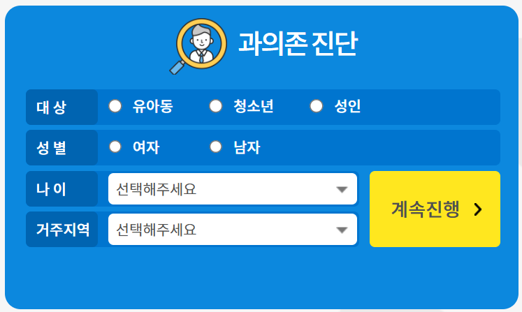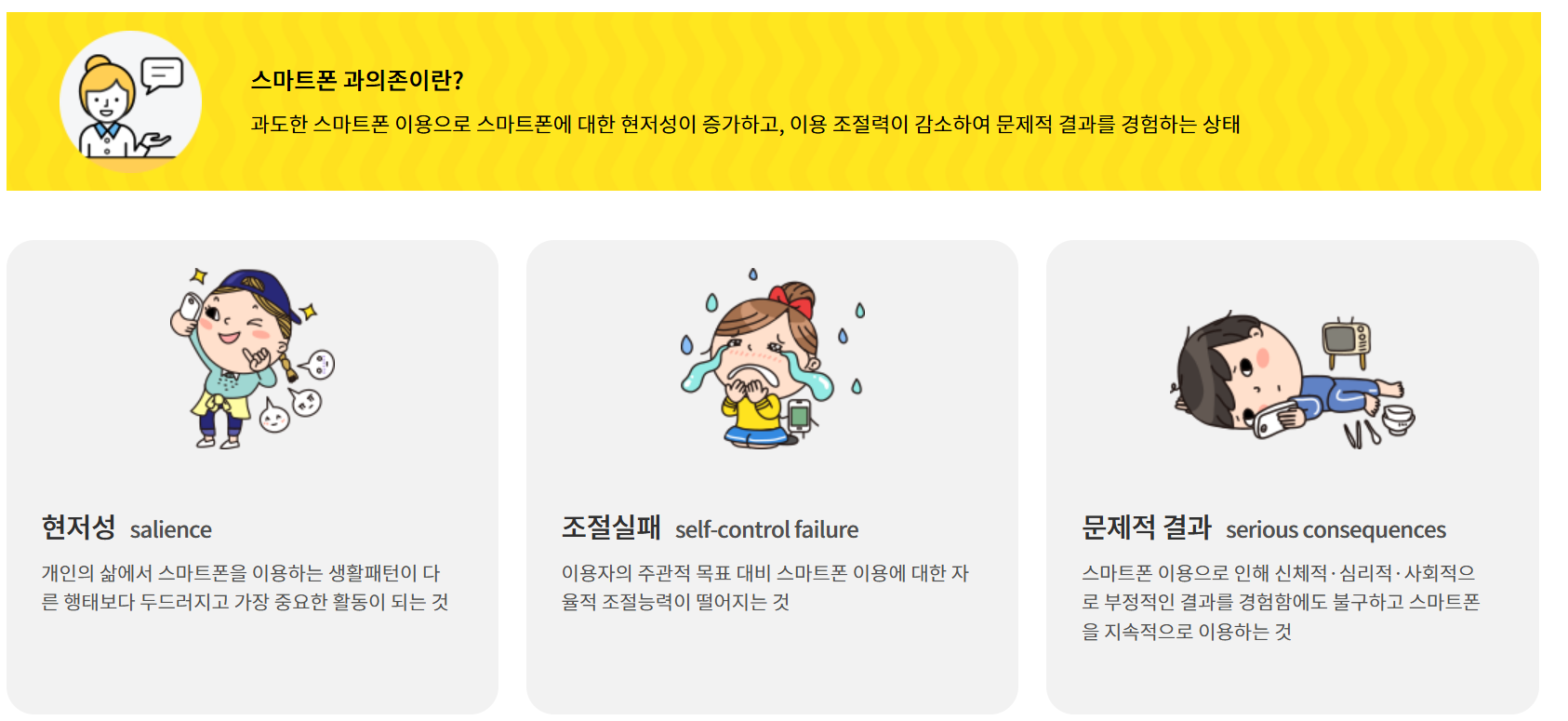 스마트쉼센터(한국지능정보사회진흥원 NIA)에서는 인터넷·스마트폰 중독 자가진단 서비스를 운영하고 있습니다.